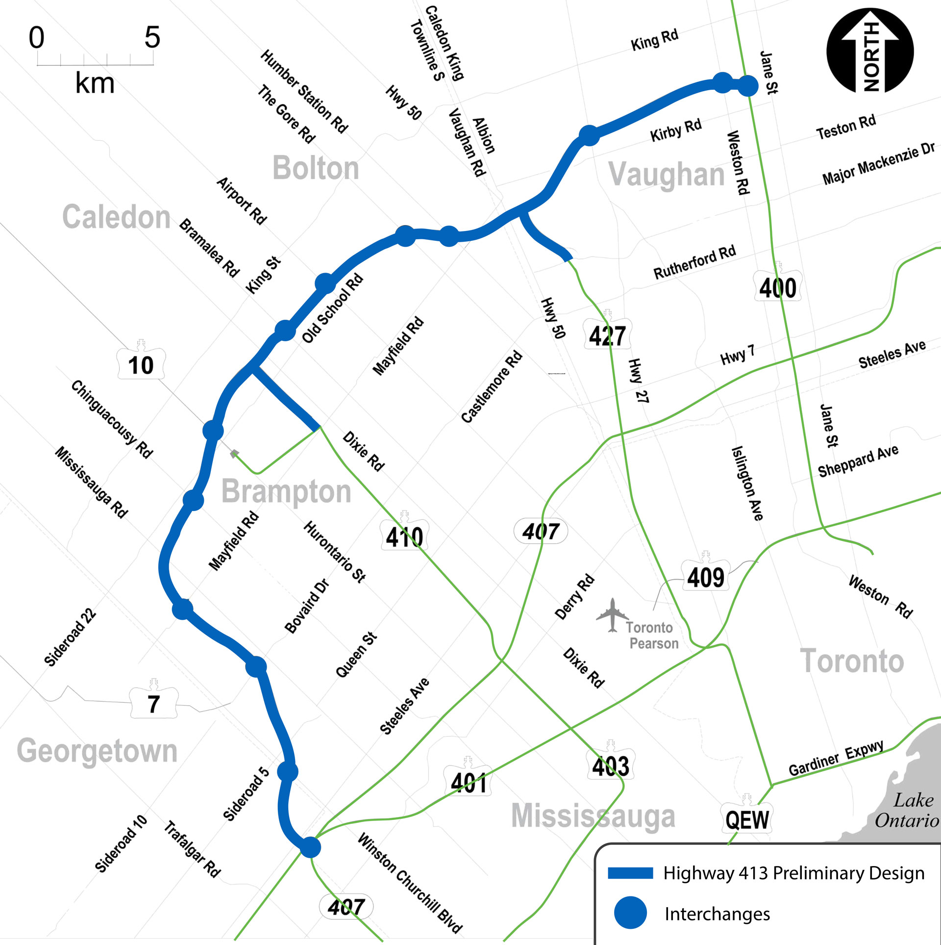 Highway 413 will extend from Highway 400, between King Road and Kirby Road, to the 401/407 ETR interchange in Mississauga, Milton and Halton Hills.