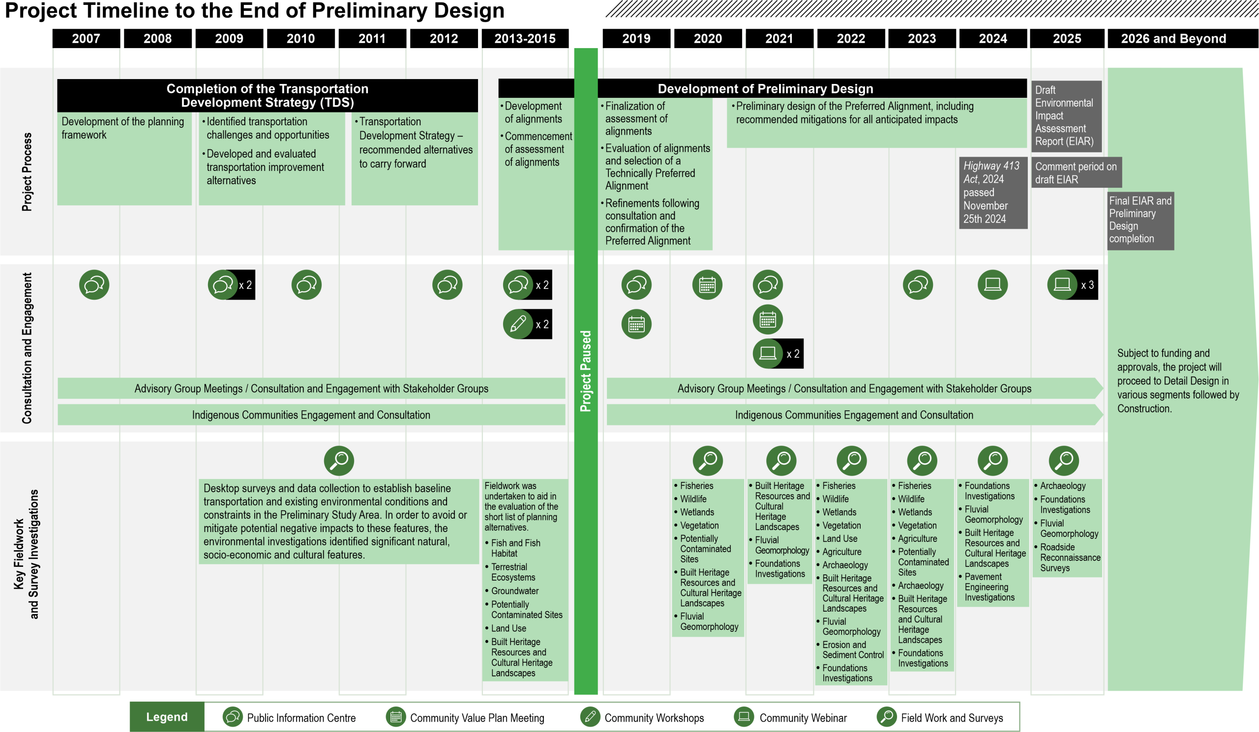 The requirements of the Highway 413 Act, 2024 build upon the considerable work completed on the Project to date, including environmental studies and ongoing consultation and engagement, that MTO and their consultants have undertaken to advance the work since the commencement of the Highway 413 Project in 2007.