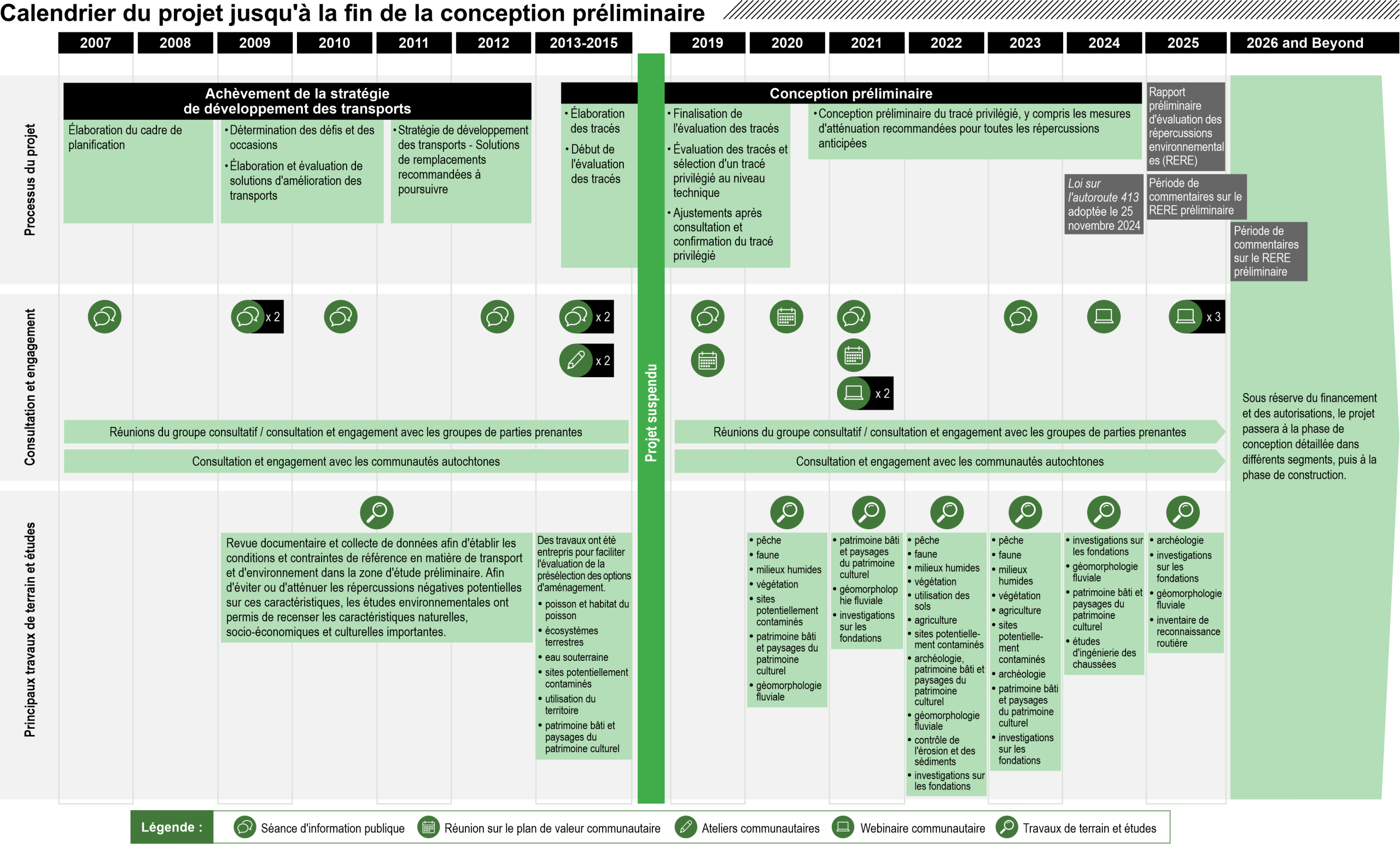Les exigences de la Loi sur l'autoroute 413, 2024, s'appuient sur les travaux substantiels réalisés à ce jour dans le cadre du projet de l'autoroute 413, y compris les études environnementales et la consultation et l'engagement continus, que le MTO et ses consultants ont entrepris pour faire avancer les travaux depuis le début du projet en 2007.